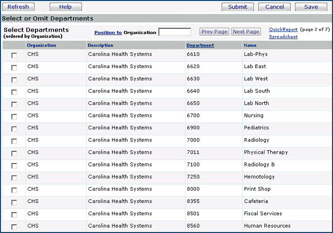Select the checkboxes next to any departments that you wish to include in the data profile. Users assigned to the data profile will have access to information for the departments selected.