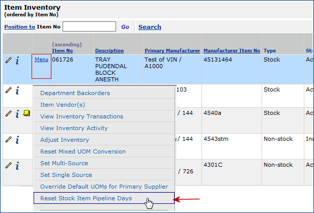 On the User Profile Authorities tab, the field Allow Pipeline Days Reset controls access to the menu option Reset Stock Item Pipeline Days on the item inventory menu (Figure 13).