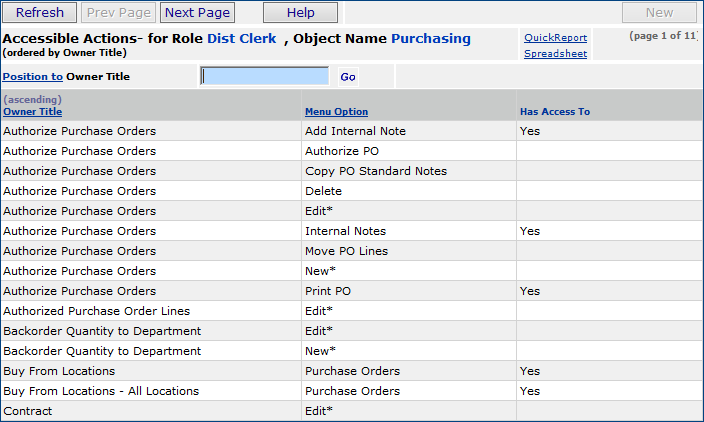 To view the actions/features allowed by each role object, click Menu > Has Access To... next to any role object in the list (Figure 2). The allowed actions/features for the role object appear (Figure 3). Figure 3 displays the first page of accessible actions for the Purchasing role object in the DistributionClerk role.