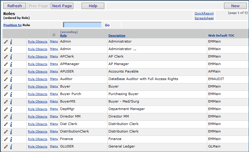 You can restrict users' access so that users in certain roles do not see parts of the system that they do not work with. The Contents that these users do see only contains the allowed features. Notice that the last column in the Figure 1 Roles list - Web Default TOC - contains the default table of contents for users assigned to each role. You customize the table of contents for a role by omitting menu areas.