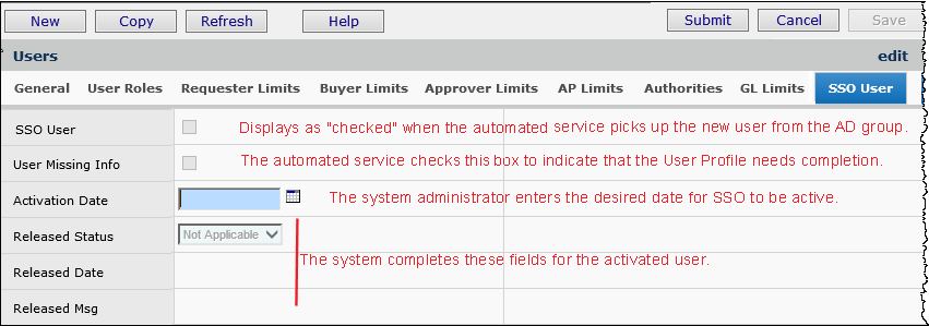Single Sign On Sites: If the user you are creating (or updating) is a single sign on user; that is, if you enter Yes in the column Single Sign On User then the column for the single sign on Activation Date must also be completed with the date when you would like the user to have access to ERP.