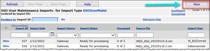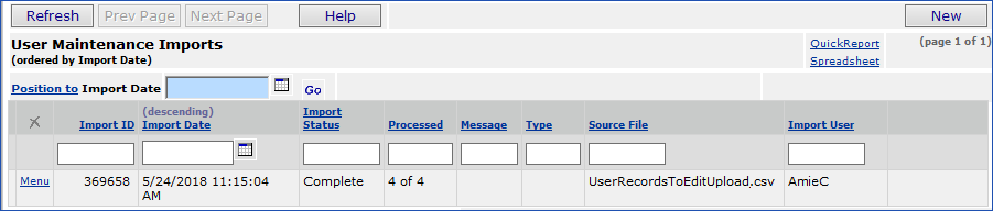 - Click Submit. The system attempts to upload your file and validate it. The User Maintenance Imports or User Create Imports panel appears.