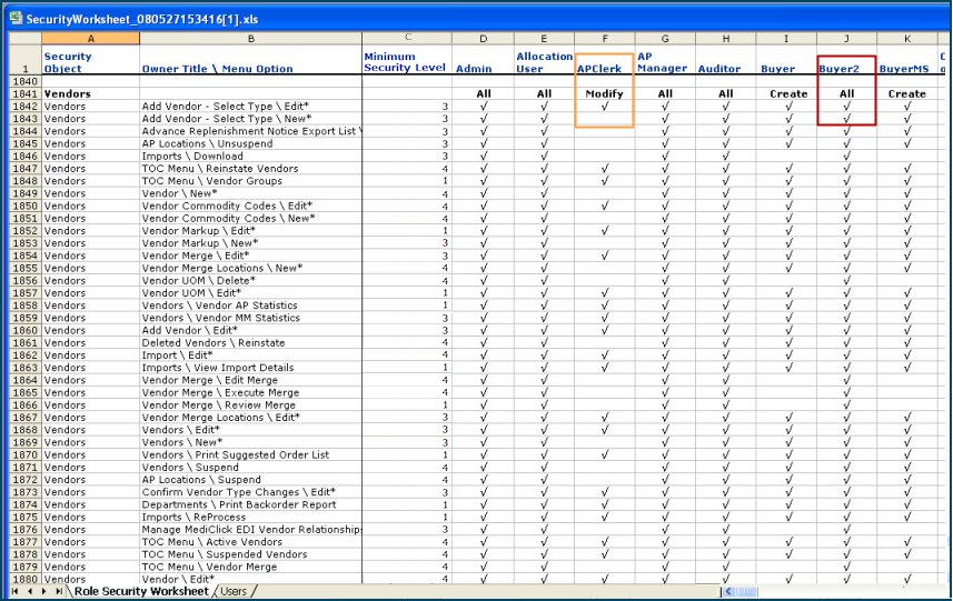 In Figure 4, for example, two roles "AP Clerk" (orange) and "Buyer2" (red) have the settings Modify and All, respectively, for the role object "Vendors". Reading down the worksheet columns, AP Clerk has a check in the row Add Vendor Select Type\ Edit*, but not in the row Add Vendor Select Type\ New*. The Modify setting allows users with the AP Clerk role to edit vendor records, but not to create them.