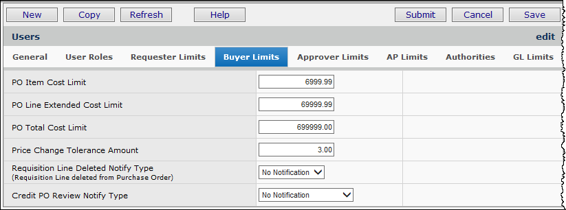 Compare the AP Clerk role to the Buyer2 role. Buyer2 has the setting All for the "Vendors" role object. Buyer2 can edit vendor records, but can also create vendor records, as specified by the check in the row Add Vendor Select Type\ New*.