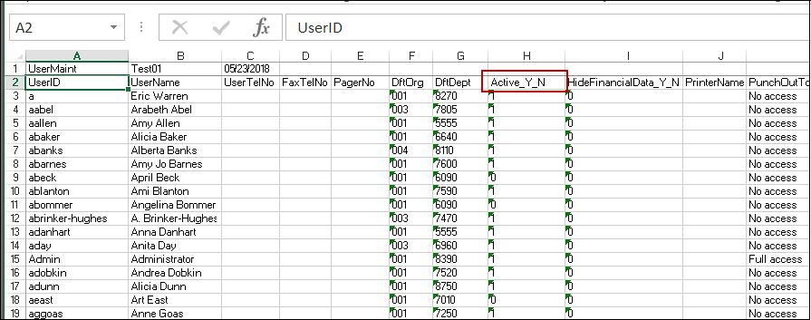 For maintenance, first export existing user records to an Excel worksheet. A new panel is available for the export task. Then, using the worksheet as a template, make changes as needed to the user data, Save the worksheet as a .csv file, and finally upload it to the application.