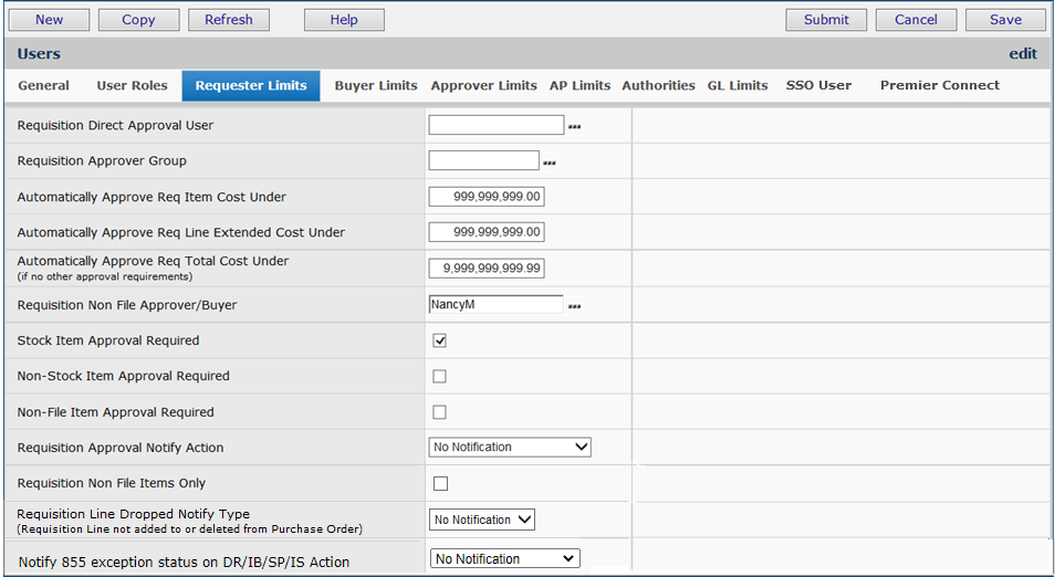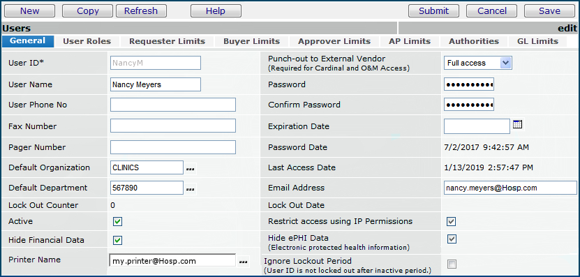 For any user, certain functions -- such as working with patient information, approving requisitions, and posting journal vouchers to the General Ledger -- need authorizations set in the user's profile. User authorization settings, limits, and similar types of user profile information are in this section as well.