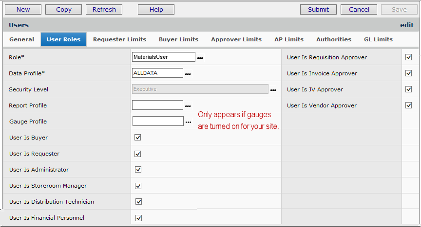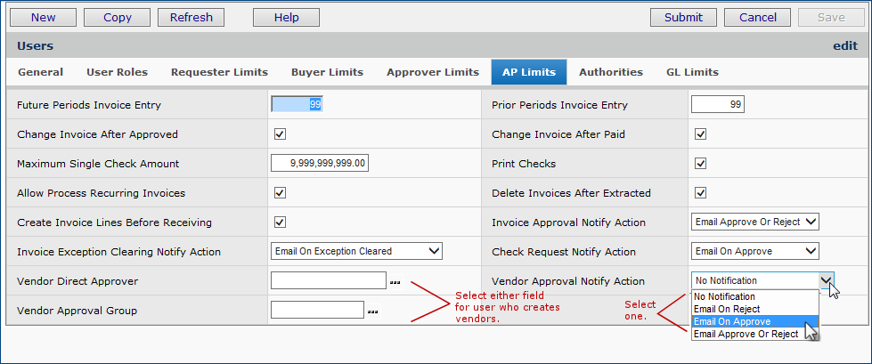 For users who create new vendors, each user profile lets you specify whether vendor approval is required, and notifications (if any). Several fields on the AP Limits (Figure 7) panel are available for this purpose.
