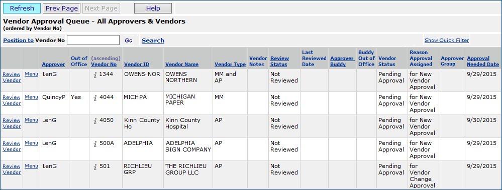 All Vendor Approval Queues shows vendors assigned to all approvers.