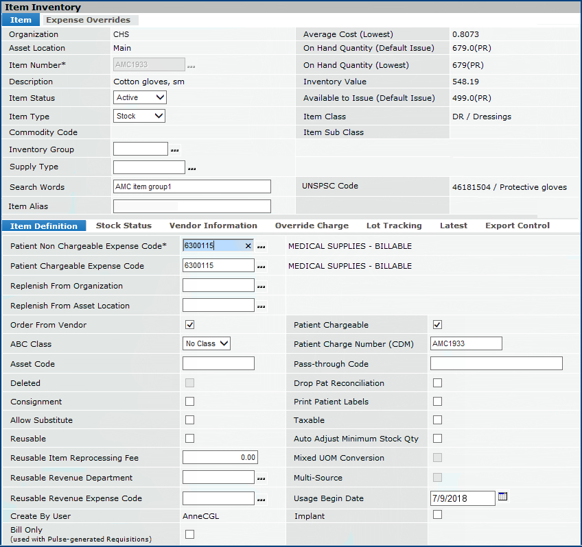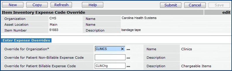 - Expense Overrides: Lists the expense codes for the Issued To organization that will override the existing default expense codes for patient billable and/or non-billable items in the issuing organization. This tab will only be visible if the Override Item Inventory Expense Codes flag has been enabled in System Values (Administration > Administration > System Values > Other tab).