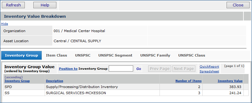 - Select the UNSPSC tab to view inventory value by UNSPSC code. The remaining tabs -- UNSPSC Segment, UNSPSC Family, and UNSPSC Class -- display inventory information by each 2-digit UNSPSC code portion: segment (the first two code integers); family (the second two code integers), and class (the last two integers). For details on UNSPSC codes, see Using UNSPSC Codes.