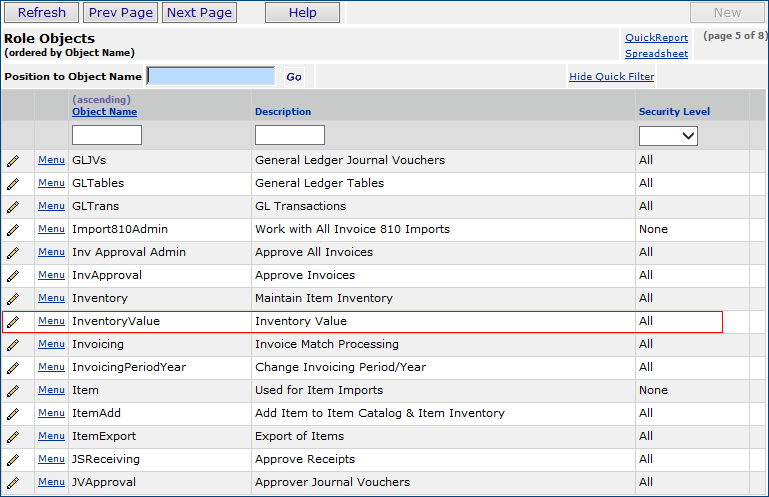 Permission to run inventory values is provided by the "Inventory Value" role object (Figure 12), which must be included in the user's role, and set to All. (See Set Up and Maintain Users for details on role objects.)