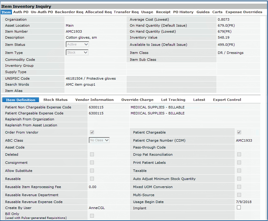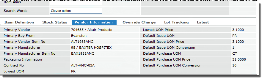Asset locations are repositories for item records, including vendor, manufacturer, and contract information. The item data is available for requisitioning, purchasing, receiving, invoicing, and accounts payable activities, regardless of whether the hospital keeps inventories of items on hand, or uses a stockless supply process.