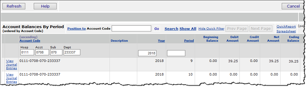 - On the Account Balances by Period panel, click View Journal Entries in any row for a year and period.