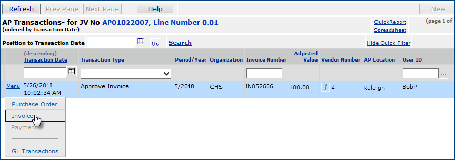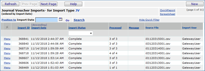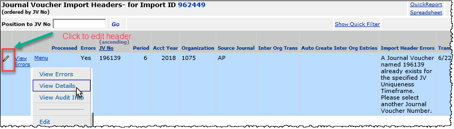 GL > Imports/Exports > Import External Chase Journal Vouchers > Menu > View Import Details