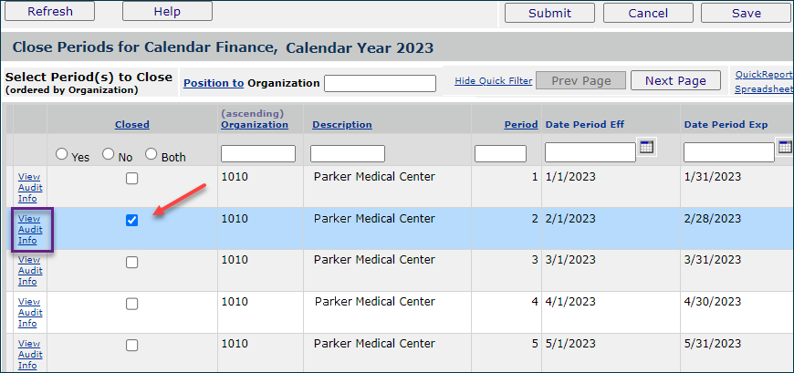 Figure 57 - From the Organization List: Selecting Periods to Close or Open