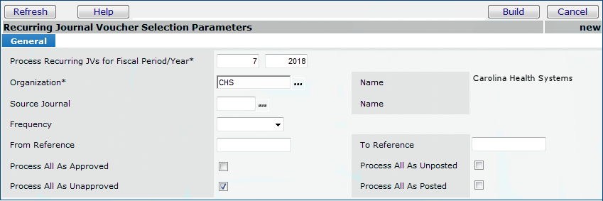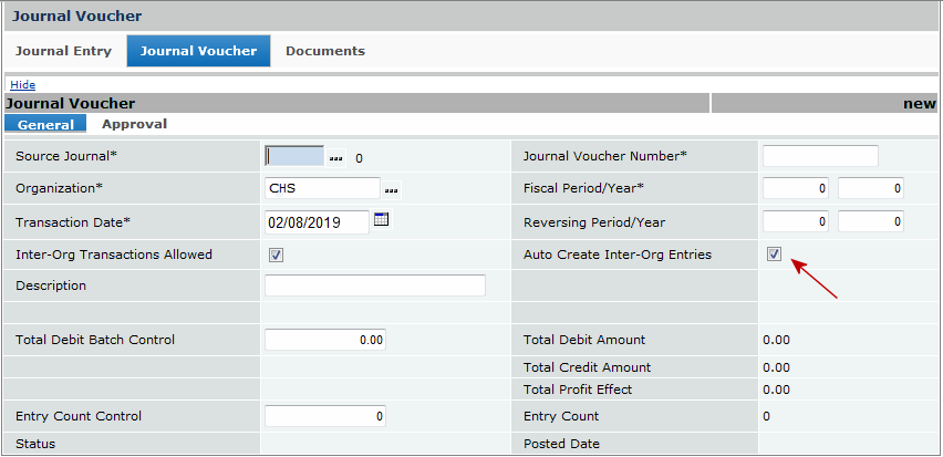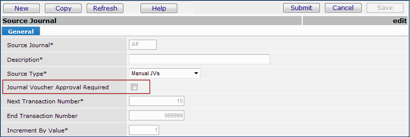 You can require approvals for manual journal vouchers. Several options are available for approval processing, which requires setup. (The approval process is not used with recurring and statistical journal vouchers.) See Journal Voucher Approval Processing for details.