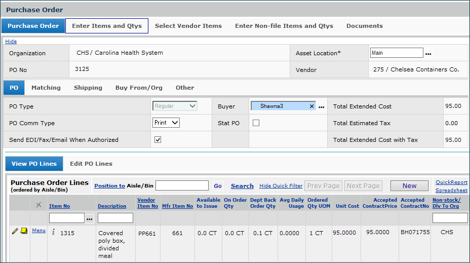 Since the on-hand quantity is only 500 (and the item is not currently on order), the system needs to order more. When the requisition is approved and released, an order is created for the item. If a purchase order for the item vendor is open, and has no special characteristics, the system adds the requested item to the open purchase order. (Special characteristics include situations where a department needs to have its POs written separately from all the other departments. In this case, the system would not add the item to an open PO for a such a department.) If the item cannot be added to an open purchase order, a new purchase order is created. Figure 6 shows the new purchase order 3125 for item 1315 from the Purchase Orders list. Figure 7 displays details about the PO.