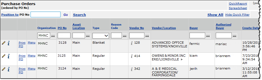 You can use the Quick Filter to display purchase orders for a particular organization, as in the figure below.