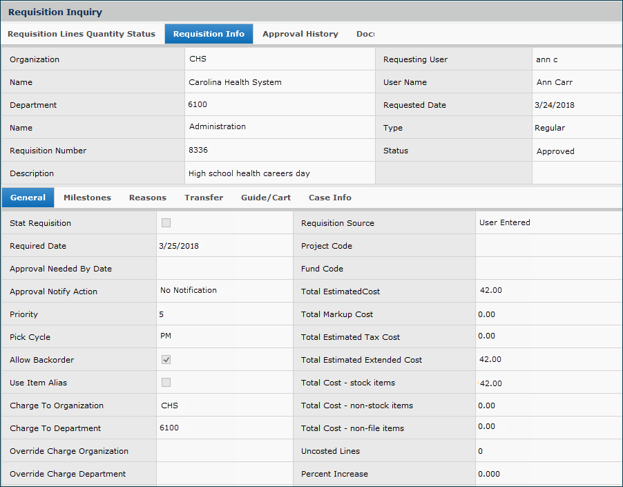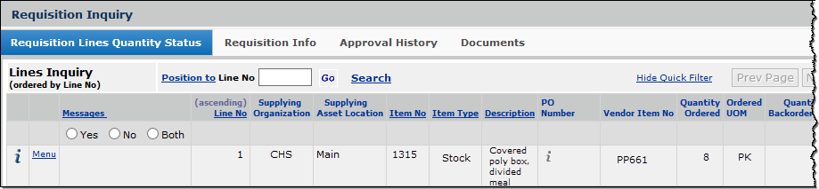 The department that needs the item creates a requisition for the item. Figure 4 shows the requisition, numbered 8336. Clicking the Requisition Lines Quantity Status tab displays the quantity information for the requested item, as shown in Figure 5.