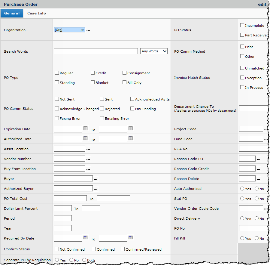 Separate purchase orders can be set up for either a vendor or department/organization requirement. See Separating Purchase Orders for details.