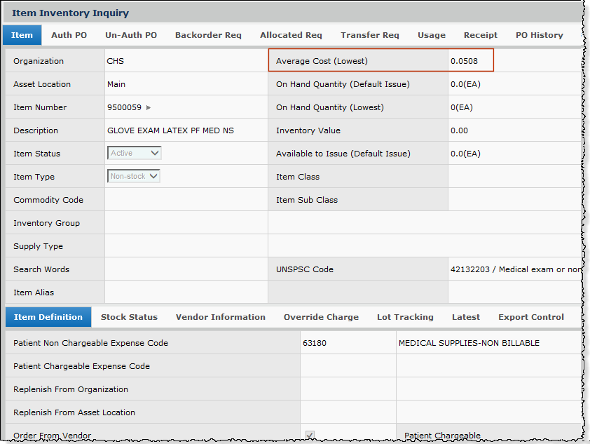 Figure 1 - Item Inventory Inquiry Panel: Average Cost