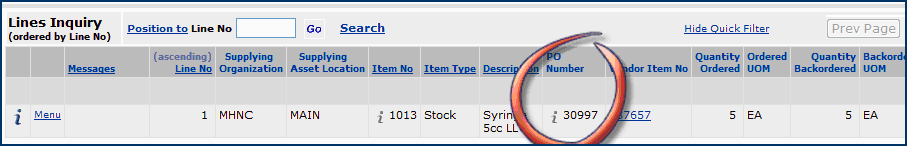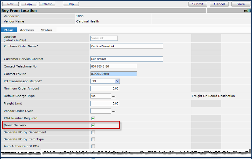 Supply Chain puts the item on a direct delivery PO for the Cardinal buy-from location Valuelink (Figure 10). Valuelink is a vendor buy-from location for the item designated as direct delivery (Figure 3).