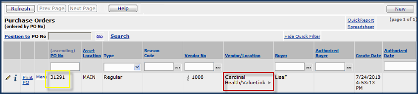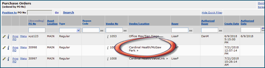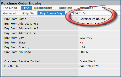 The purchase order vendor buy-from location (Figure 16) is the default for Cardinal (McGaw Park), rather than, compared to a direct delivery PO, the Valuelink buy-from location (Figure 4 and Figure 10).