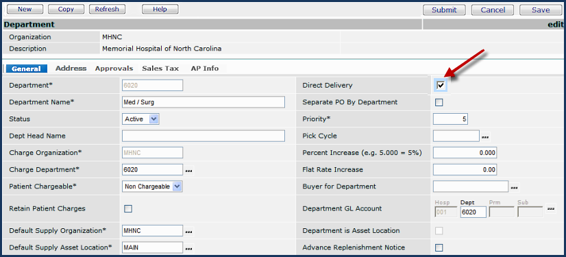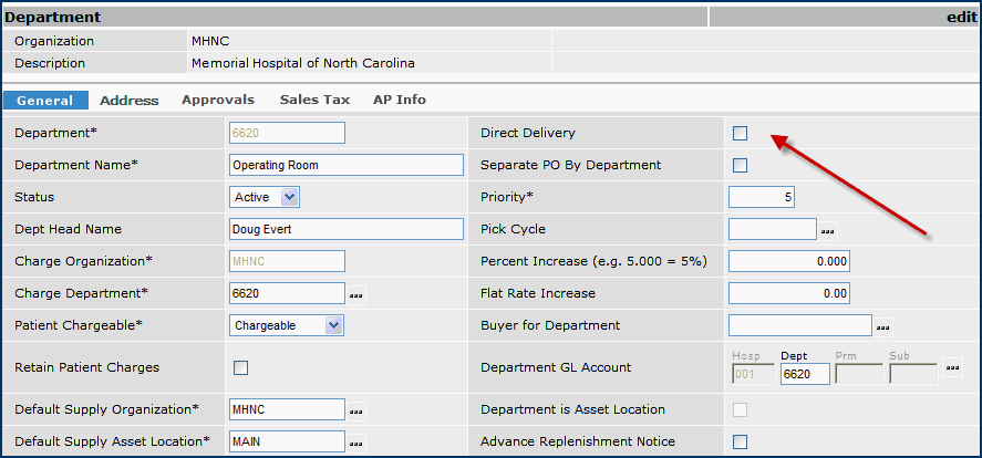- Flag the department as "direct delivery." The department record contains a field for this purpose.