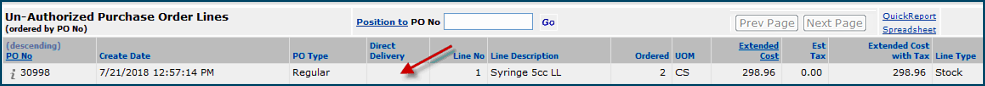 Figure 15 - Direct Delivery Column on the PO Line is Blank