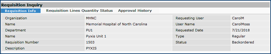 The requisition inquiry header and the inquiry line are in Figure 12 and Figure 13, respectively. The requisition -- for a stock item -- was created manually. The item is backordered because the on-hand quantity is less than the ordered quantity.