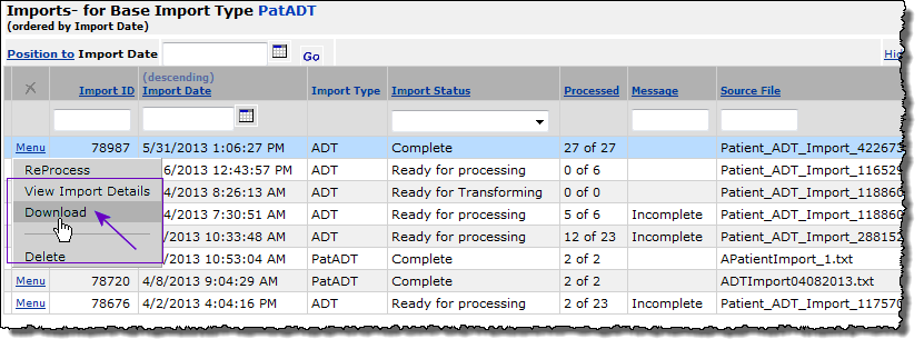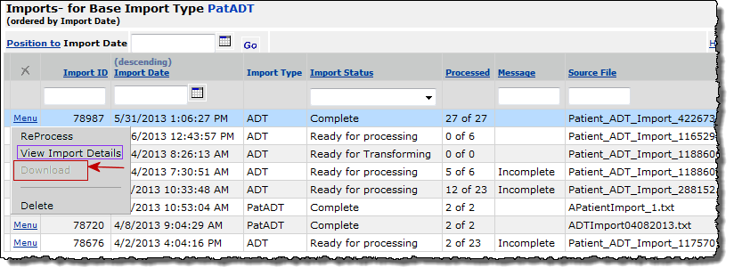 - Imports/Exports & Financial Data > ADT Patient Import: Imports list menu > Download (See Example 5.)