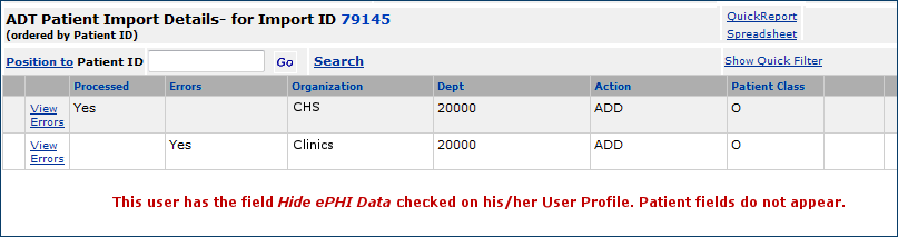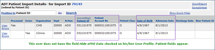 Figure 5 - ADT Patient Import Details: Hide ePHI Data Is Unchecked on the User Profile - User Can View ePHI