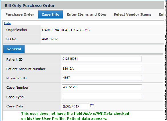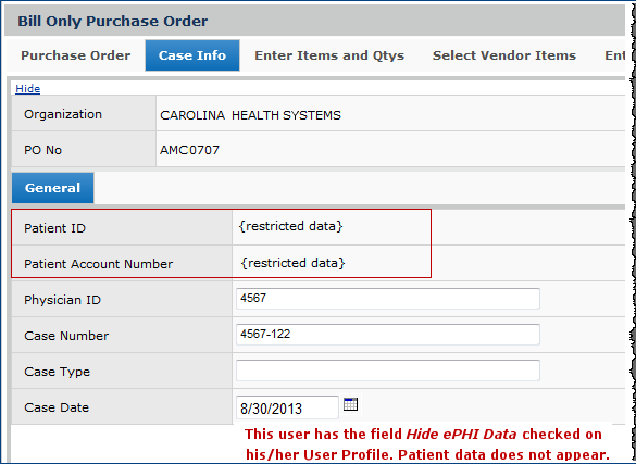 Figure 7 and Figure 7A show the bill-only PO Case Info panel for a non-restricted and restricted user, respectively. Users who are not authorized to work with ePHI data cannot display patient information on bill-only purchase orders and also cannot enter patient information when creating a purchase order.