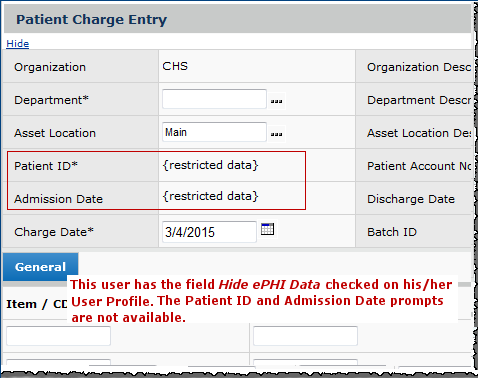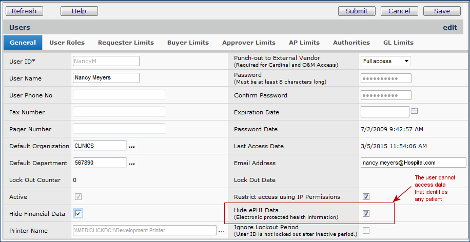 Important: You should be aware, however, that if you enter free-form ePHI data in user notes attached to contracts, purchase orders, requisitions, order guides, item records, invoices, and any other application documents, the ePHI data cannot be protected from display (or editing) by unauthorized users. Your site may wish to establish a policy for notes so that you are not inadvertently making ePHI information visible.