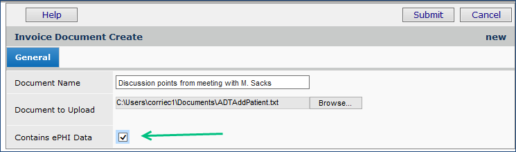 For users who can access ePHI information, a checkbox on the Document Upload panel protects the document from display by other users without ePHI authorization.