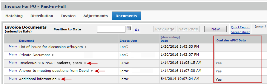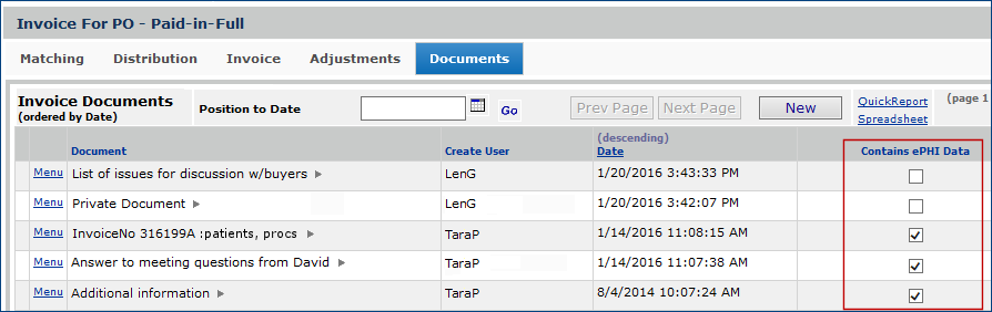 This feature is available for documents attached to purchase orders, requisitions, receipts, invoices, check requests, vendors, and journal vouchers. When a User Profile does not allow the user to work with ePHI information, and when documents attached to invoices, POs, receipts, etc. are flagged for ePHI information, the user cannot view the documents.