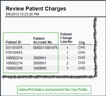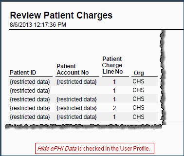 In Figure 12A, a user with the Hide ePHI Data flag checked on his User Profile has printed the report. Patient data is hidden.