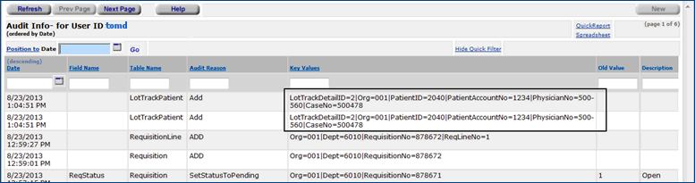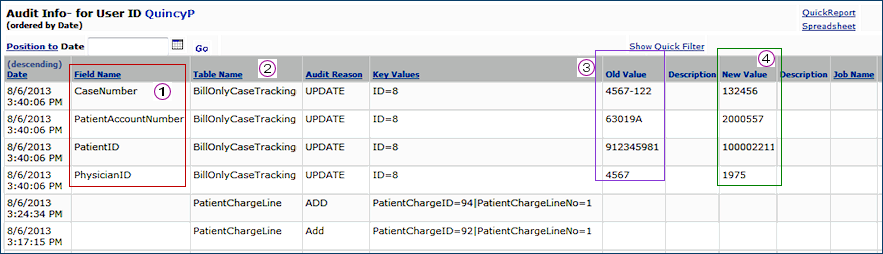 Under Field Name, the Case Number, Patient Account Number, Patient ID, and Physician ID have been changed. The Audit Reason column displays "UPDATE."