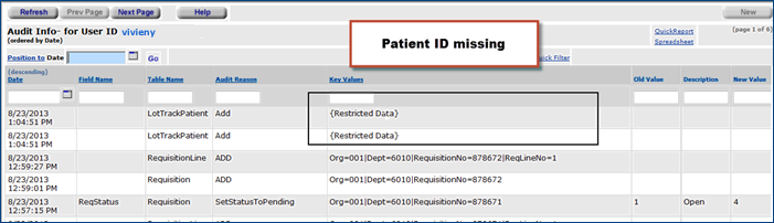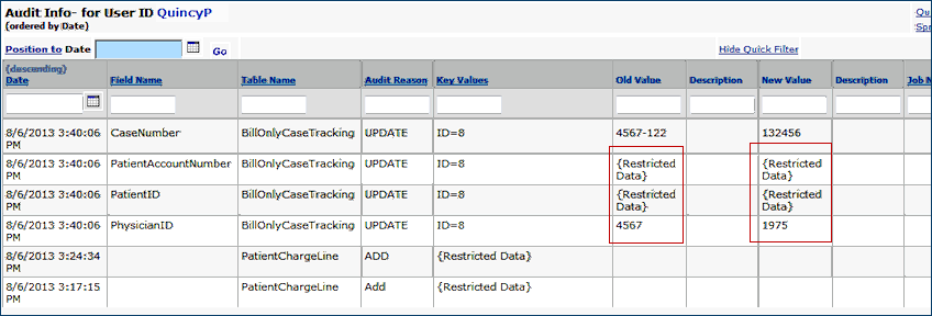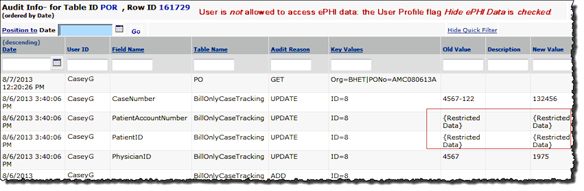 When a restricted user displays these log or audit lists, if the audit contains changes, deletions, or additions of ePHI data, the ePHI data is hidden from the user.