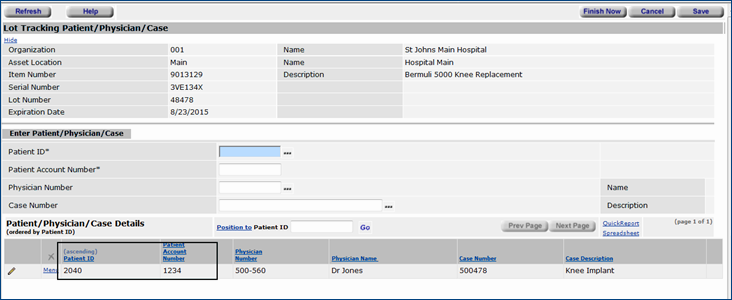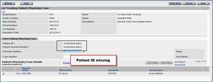 In contrast, for a user with the ePHI restriction field checked on her User Profile, the Lot Tracking Patient/Physician/Case edit panel does not display patient data, nor can the user enter patient data (Figure 10). For the unauthorized user, the audit of lot tracking fields looks like Figure 10A.