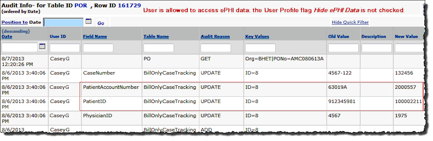 Changes to the Hide ePHI Data field are logged and visible from the audit table for each user.