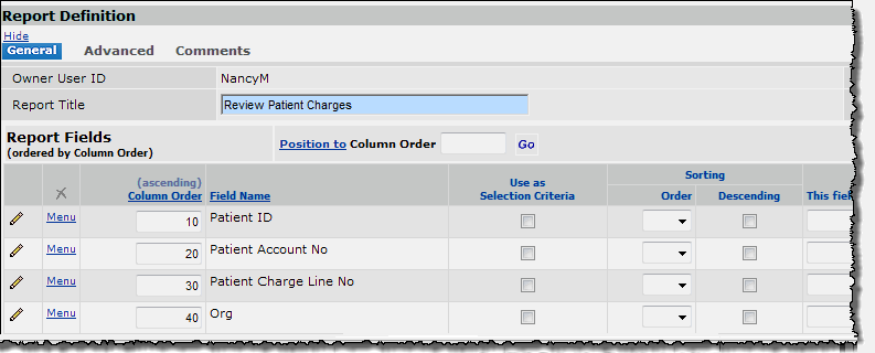 Figure 11 is part of a simple report definition that prints patient charges. Figure 12 and Figure 12A show the report output for a non-restricted user and a restricted user, respectively.