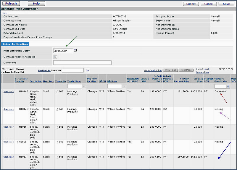 - For items with activated contract prices, but no new prices to activate, the Contract Price Status column is blank; for example, in Figure 13, item H1917 (blue arrow).