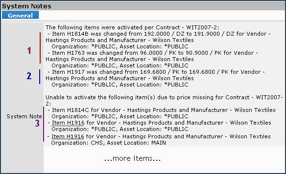 Clicking Display next to a line of system notes provides detailed information about item price activations.   Since the system runs all the items in a contract through the activation process, when you Display the system notes for a price activation, you will see entries such as those in Figure 16: