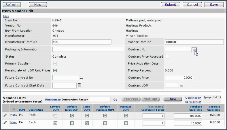 You can also enter a Contract Price and a Contract Price UOM if you have a new contract price to activate. See the section Activating Contract Prices.