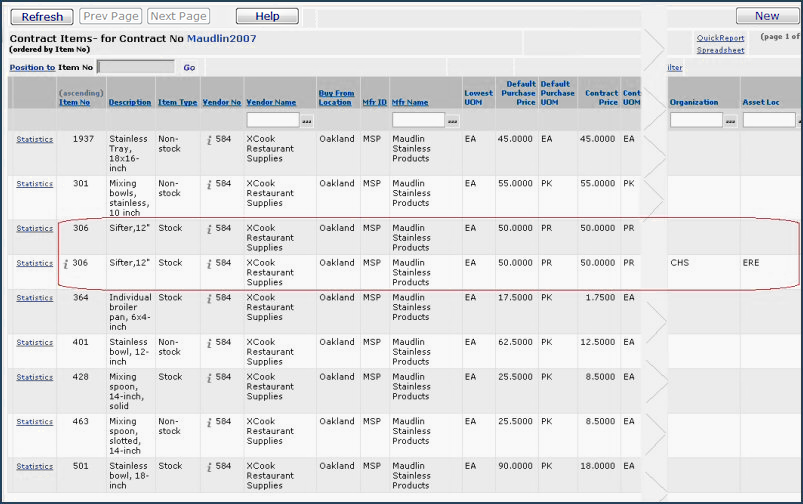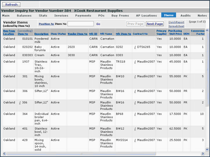 - In column five of the Contract Items list, clicking  i next to a Vendor No  inquires on an item vendor. Then, on the Vendor Inquiry panel, selecting the Items tab (Figure 3) lets you view a list of all items (contract and non-contract) that the vendor supplies (Contracts > Items tab > Vendor Inquiry > Items Tab). Notice, in Figure 3, the multi-sourced item (306, Sifter) listed twice, as in Figure 2.