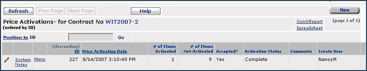 Figure 12 - Contract Price Activations List for a Contract