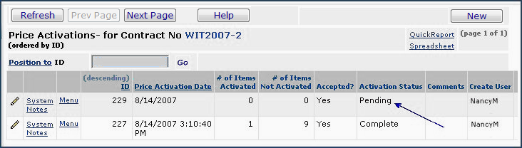 Figure 14 - Price Activations List with New Pending Activation Job