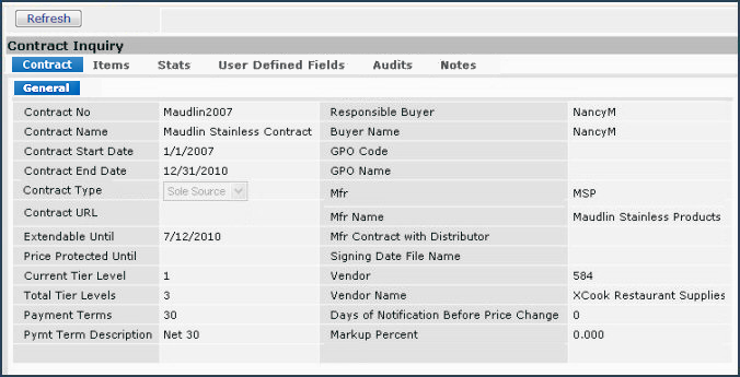 The following sections describe how to use the Contract, Items, and Stats tabs. The User Defined Fields, Audits, and Notes tabs contain the same types of data as these same tabs on other inquiry panels.