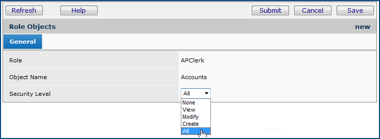Each role is associated with several role objects. A role object is a category of system data such as Invoicing or Distribution. Users perform different activities with the data as part of their work.